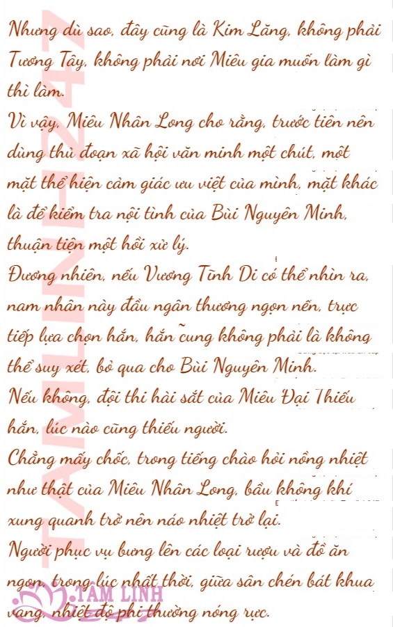 Vương Tĩnh Di nghe Miêu Nhân Long nói xong, mới thở phào nhẹ nhõm nói: “Được, tối nay ta sẽ thanh toán!”