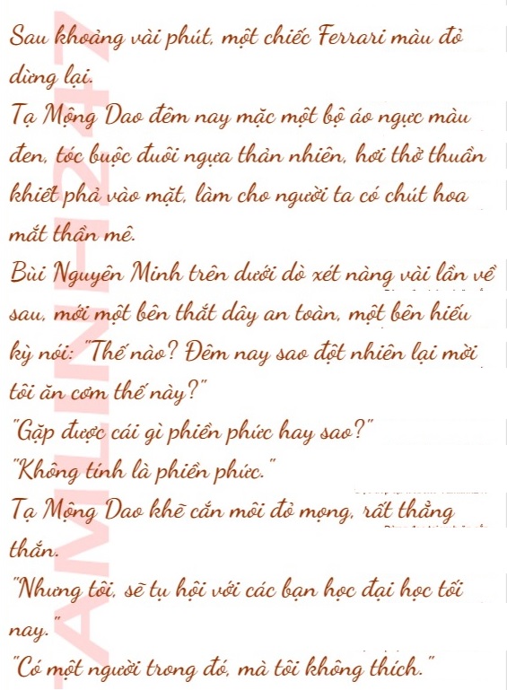 Tạ Mộng Dao qua điện thoại, cũng không nói chuyện đại sự gì, chỉ là cô định mời Bùi Nguyên Minh ăn một bữa, chúc mừng chiến thắng vừa rồi của anh, nhân tiện nói về Kim Tuấn Anh.