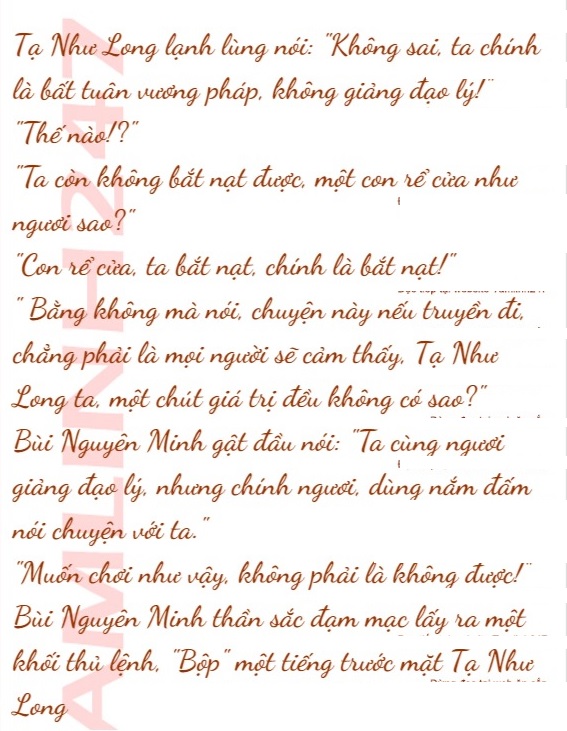 Nhưng Bùi Nguyên Minh không thèm quan tâm, mà nhìn Tạ Như Long cười nửa miệng, nói: “Tạ Như Long, ngươi quyết tâm không giảng đạo lý sao? Bất tuân vương pháp rồi sao?”