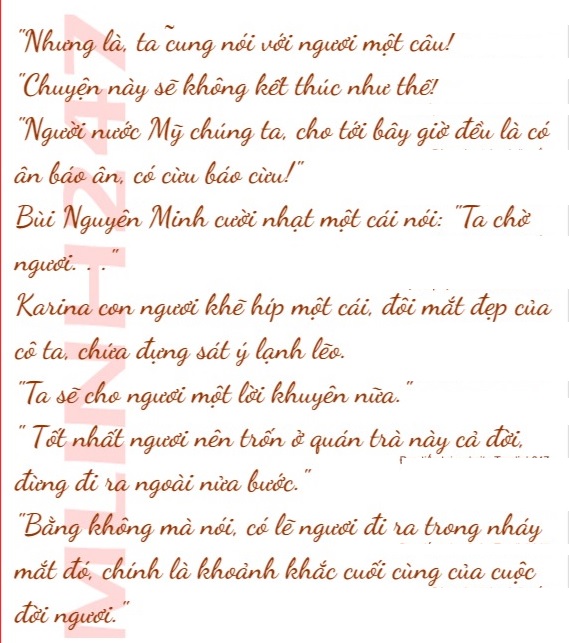 Karina giờ phút này tỉnh táo lại, nàng phất tay ngăn lại người bên cạnh, sau đó nhìn chòng chọc vào Bùi Nguyên Minh.