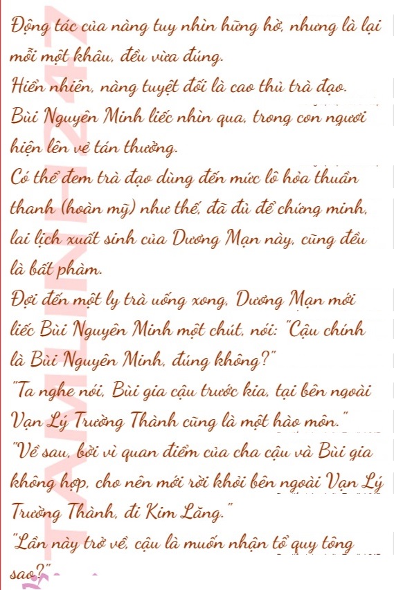 Dương Mạn tùy ý ra hiệu cho Bùi Nguyên Minh ngồi xuống, sau đó nàng lại lấy ra hai chén trà quý tử sa, để một bên nước nóng một bên pha trà.